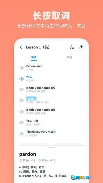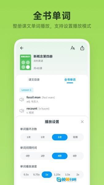支持英式美式发音自由切换;课文文本与音频精准同步播放;长按单词即时查询释义;提供单词本专项训练模块;可调节0.5-2倍速播放;单句循环和篇章精听模式;每日推送精选学习内容;自定义文字显示大小。