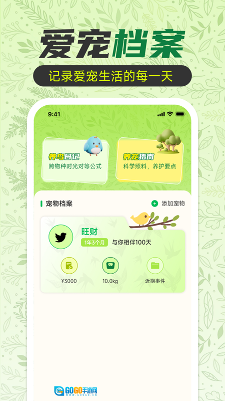 添加宠物档案的操作十分便捷,养鸟日常可以实时记录,平台还为用户准备了详尽的养宠指南。