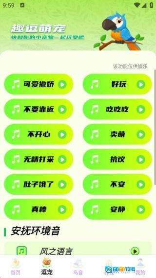 进入逗宠界面后,能看到多种鸟叫语音可供选择,这些语音都支持直接点击聆听。