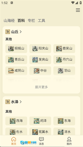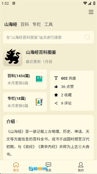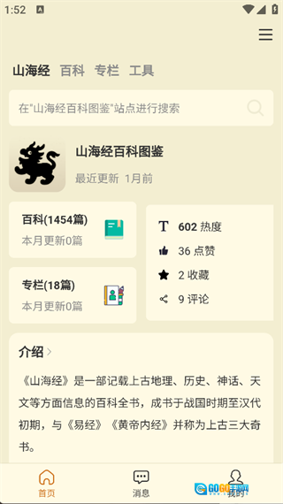 在主页面就能看到山海经百科图鉴、专栏、介绍等功能板块。