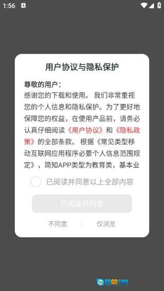 安装软件后进入应用,弹出用户协议与隐私保护相关提示,点击同意即可进入。