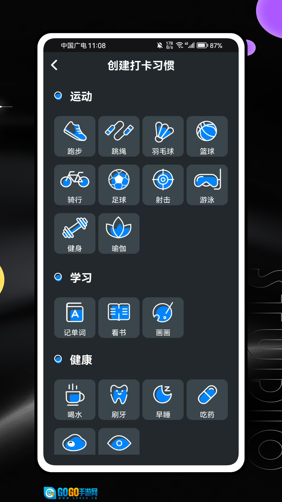 用户可以自由设定任何想养成的微习惯,像“每天晨读15分钟”“每天运动30分钟”“每晚11点前睡觉”之类的,能时刻推动你坚持行动!