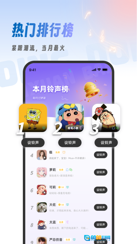 平台配备了热门排行榜功能,会呈现当月热度最高的铃声,方便用户及时把握潮流趋势,设置当下备受欢迎的铃声。