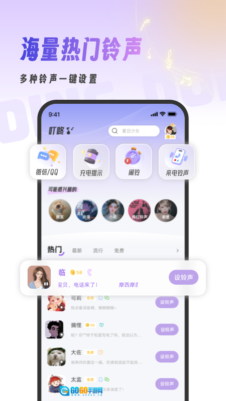 可设置微信、QQ消息提示音,以及充电提示音、闹钟铃声、来电铃声等多种类型的铃声,还能一键设置海量热门铃声。