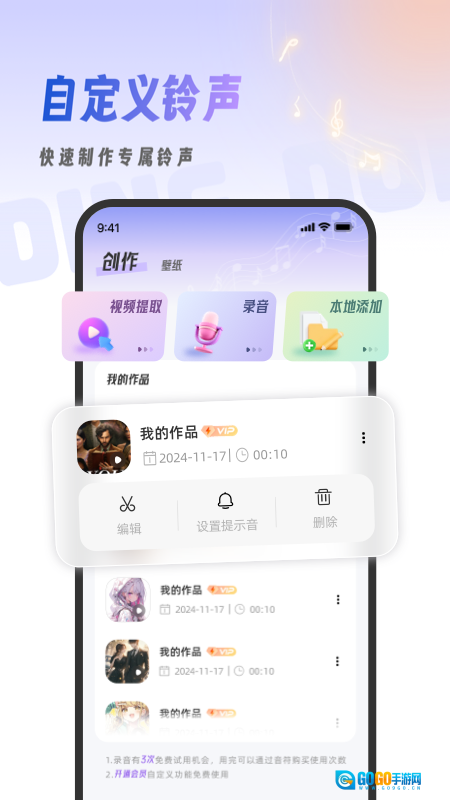 可以通过视频提取、录音、本地添加等多种途径打造专属铃声,并且能够对自己创作的铃声作品进行编辑等后续操作。