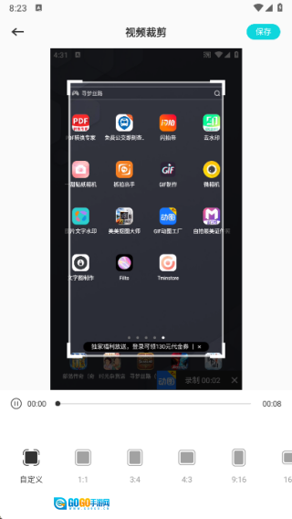 2、进入视频裁剪页面后,先挑选要处理的视频,接着选定合适的比例,最后点击保存,就能快速完成视频的剪切操作;