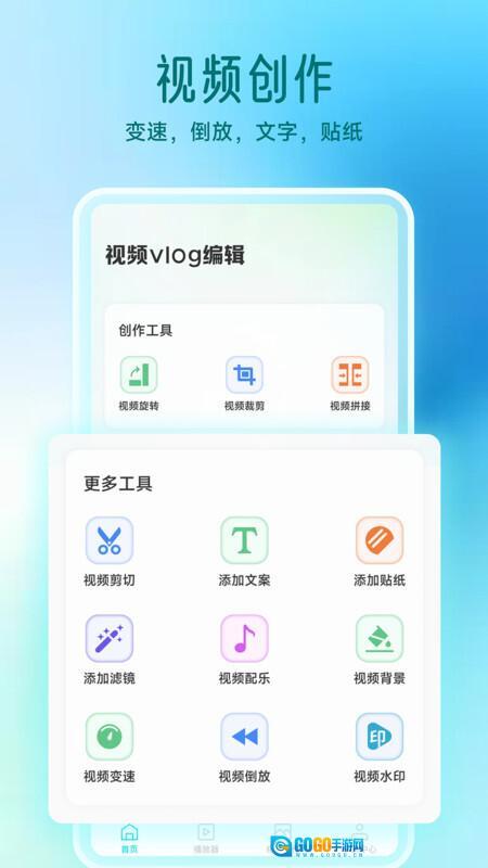 首页将提供视频旋转、裁剪、拼接功能,同时涵盖视频剪切、文案添加、贴纸添加等实用功能。