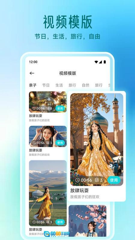 1、拥有大量风格多样的模板,能适配旅行、日常等不同场景,用户只需一键套用就能快速制作出成片,有效降低了创作的难度与门槛。