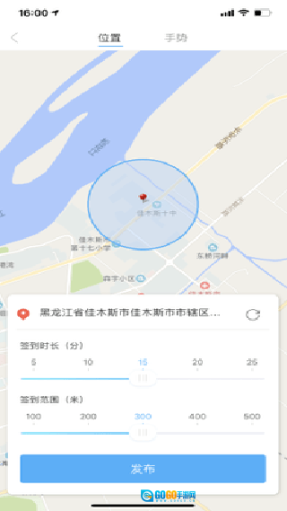位置签到:系统自动定位,若不准确则点击【刷新】。设定好签到时间与范围后,点击【发布】即可。