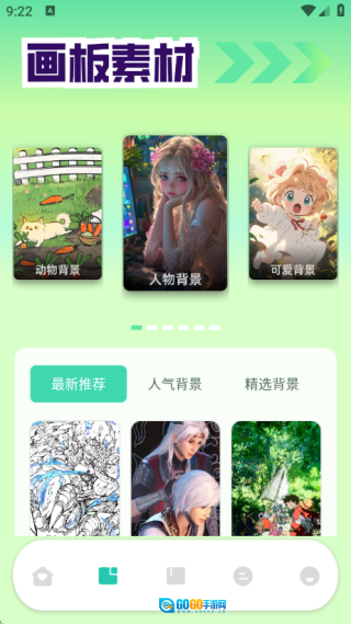 在画板素材页面里,涵盖了最新推荐、人气背景以及精选背景等功能板块。