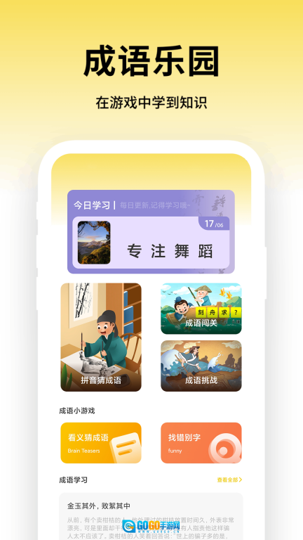 2、营造轻松无压力的学习环境,借助游戏化的设计来降低学习的门槛,让用户在愉悦的氛围里自然而然地积累成语词汇量。