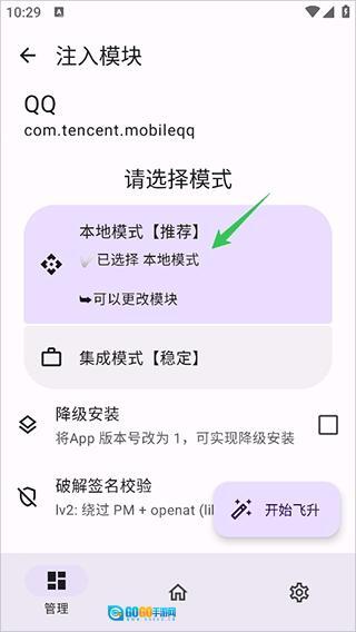 5、因为刚才提到的就是QQ的Xposed模块,所以在这里选择QQ后,系统会自动识别到本地的QQ Xposed模块,用户只需点击右下角的【开始飞升】按钮,就能完成模块注入操作。