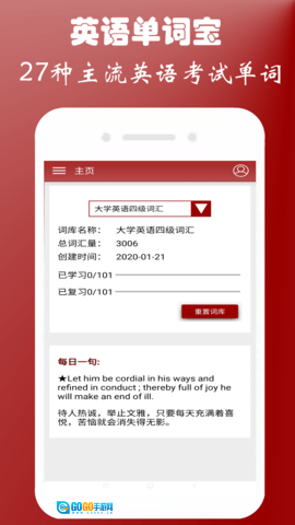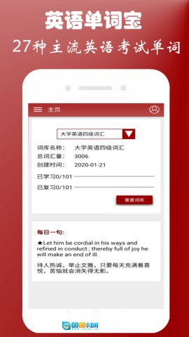 在特色功能上,英语四级单词宝配备了单词的语音朗读、注音、释义及词组等功能,助力用户从多维度理解并掌握单词的含义与用法。该应用还设有学习模式、复习模块和测试模块等多样化学习模式,以适配用户不同的学习需求。软件覆盖了四级、六级、考研、托福、雅思、新概念、公共英语、成考(专升本)、自考英语、研究生入学考试、MBA联考、MPA联考、GRE和GMAT等多个主流英语考试的单词。用户可依据自身需求挑选对应的单词学习内容,且无需注册和联网,能节省流量与时间。