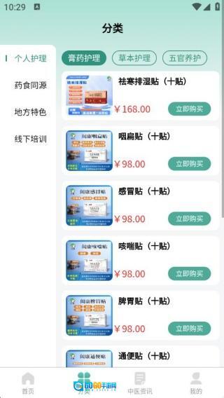 在分类区域浏览祛寒排湿贴、咽扁贴等各类中医相关商品,查看价格后点击立即购买。