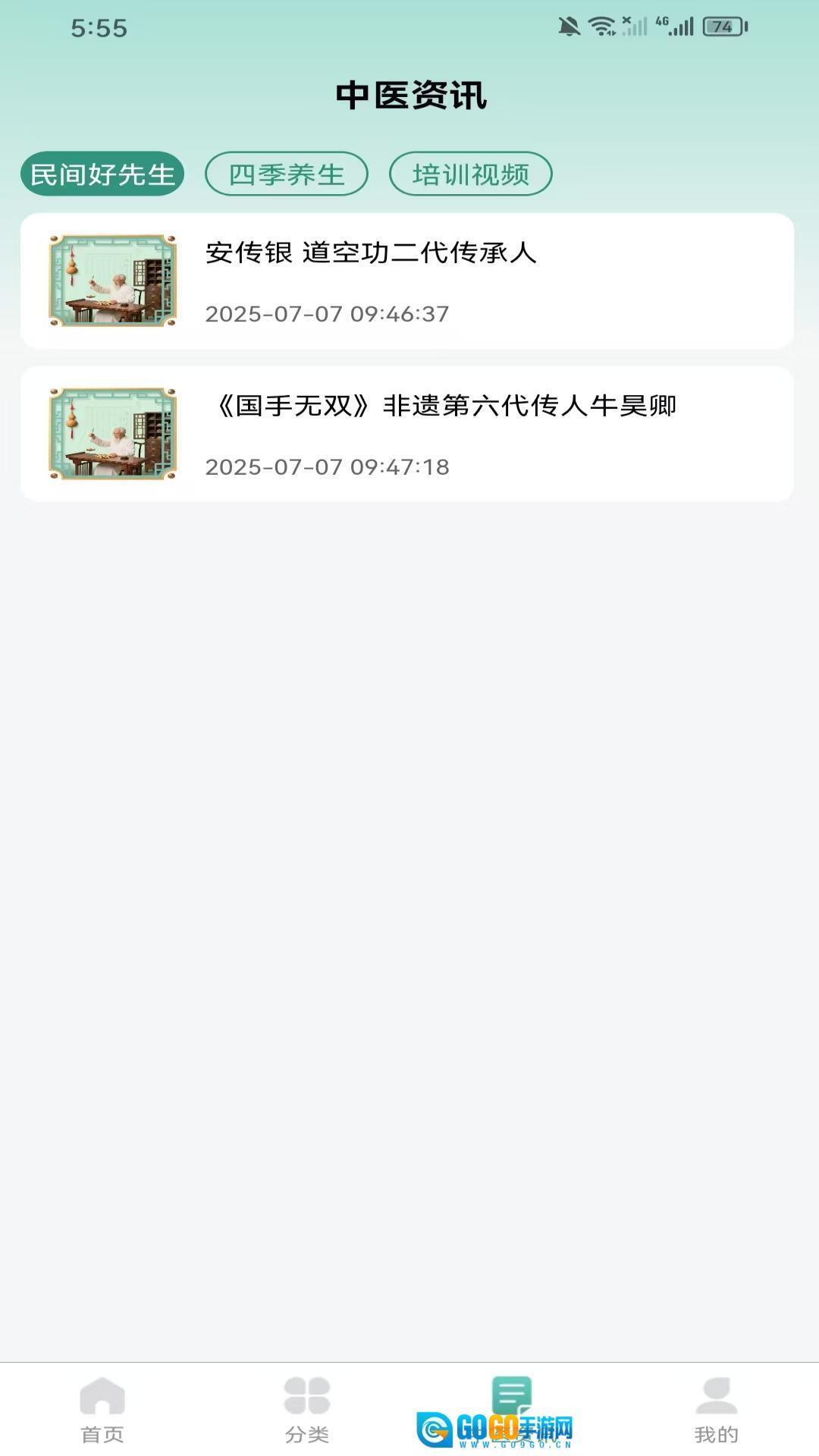在中医资讯板块,用户可以获取民间中医传承人物的相关信息、四季养生的专业知识以及各类培训视频等内容。