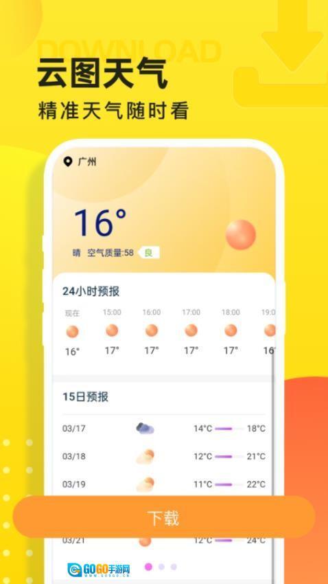 云图天气预报这是一款提供了天气预报的,还提供了特别准确的天气预报信息哦,可以帮助更多的用户知道天气的变化,来预防自己的穿多少衣服,还有其他的功能,用户都可以体验哦,满足了不同玩家的需求,还有定位模式哦,可以根据自己所在的位置,推送更准确的天气。