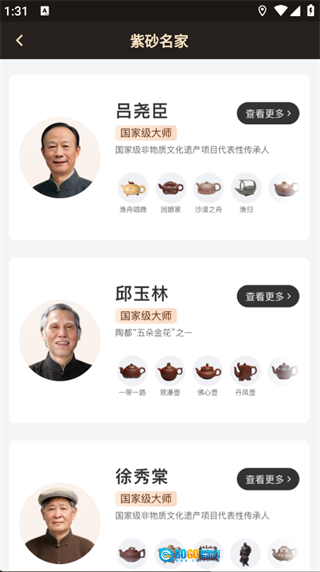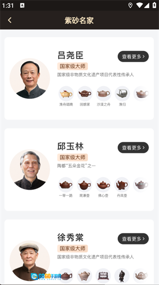 点击页面下方的“紫砂名家”选项,就能查看多位紫砂大师的相关信息。