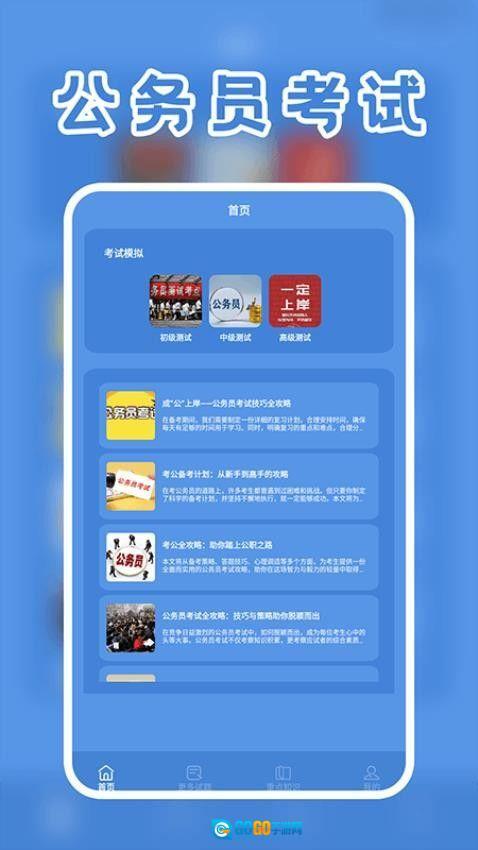 专为公务员备考打造的刷题软件,其中汇聚了海量真题和模拟题,覆盖了国家以及各省公务员考试、事业单位招聘考试等,还具有智能刷题模式,可以根据薄弱点进行针对性练习,每一道题目都有着详细的答案解析,能够让用户更好地进行理解,还提供了线上直播课程和专业老师答疑,帮助用户及时解决各种问题