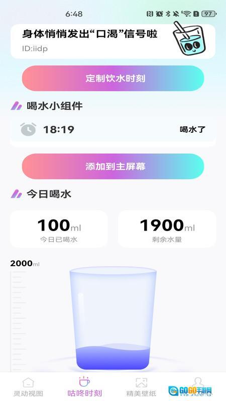 在咕咚时刻页面里,你可以找到定制饮水时刻、添加主屏幕的功能,此外还能看到今日喝水的相关参数。