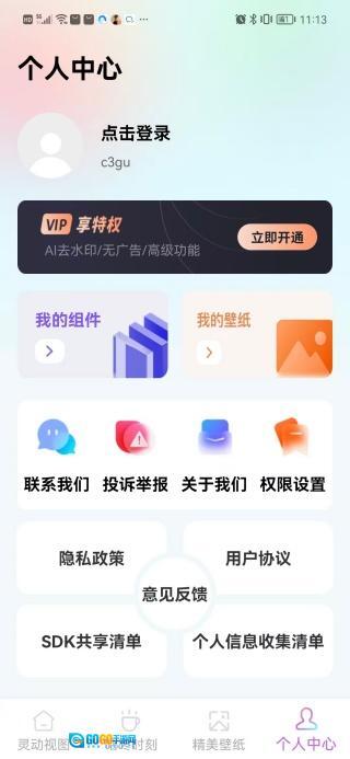 在个人中心页面,你可以开通VIP会员,还能查看我的组件、我的壁纸等各类内容。