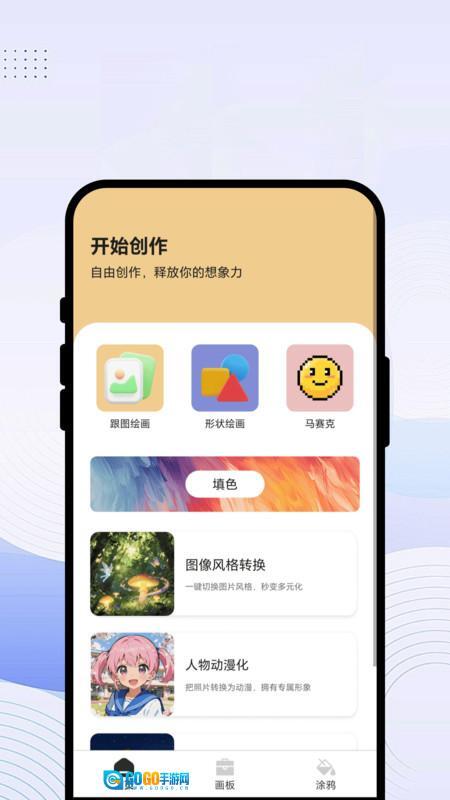 首页配备了跟图绘画、形状绘画、马赛克等功能,并且支持随时填色操作。