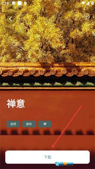 在【禅意】详情页,点击【】按钮能够保存该主题内容,并且页面上标注了“自然-舒心-禅”的标签属性。