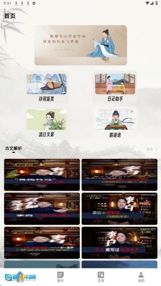 进入首页查看,展示了诗词鉴赏、流行文案等内容。