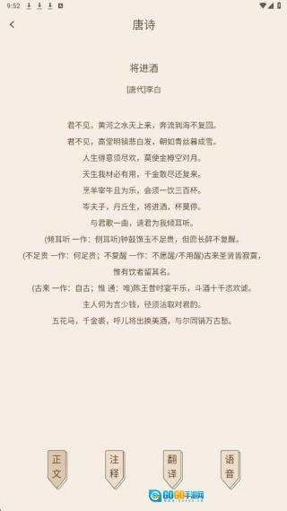 诗词朗诵功能,由专业主播领读,带您品味诗词的韵味,体会韵律的美妙,增强语感。
