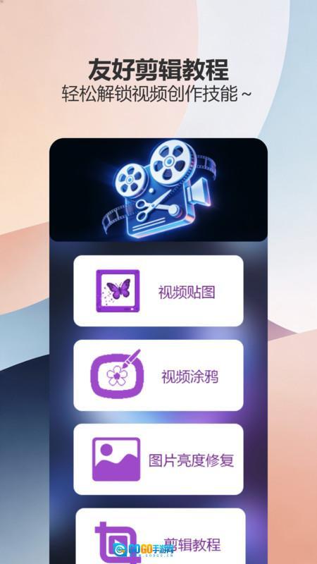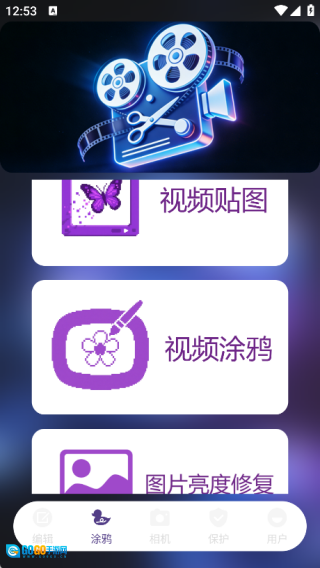 在涂鸦页面里,你能找到视频贴图、视频涂鸦、图片亮度修复功能,还有剪辑教程。