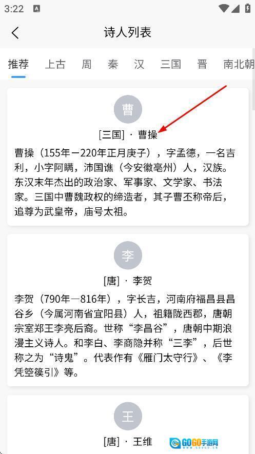 3、在诗人列表页面,点击目标诗人,即可进入其详情页面。