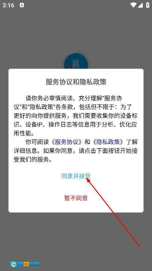 1、在弹出的服务协议与隐私政策窗口中,点击同意并接受相关条款,即可进入首页。