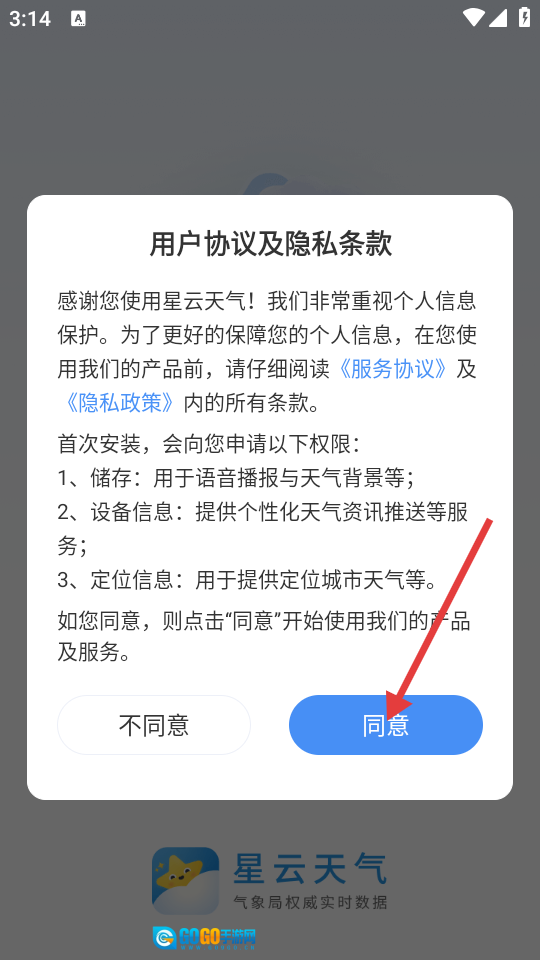 1、点击【同意】按钮,确认同意用户协议与隐私条款后,即可进入主界面。
