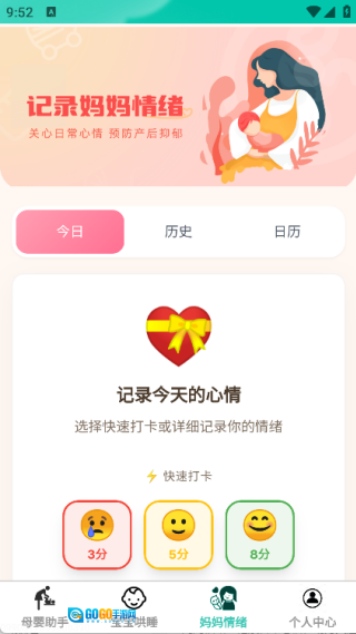在妈妈情绪页面里,能查看今日、历史以及日万等不同板块的心情记录。