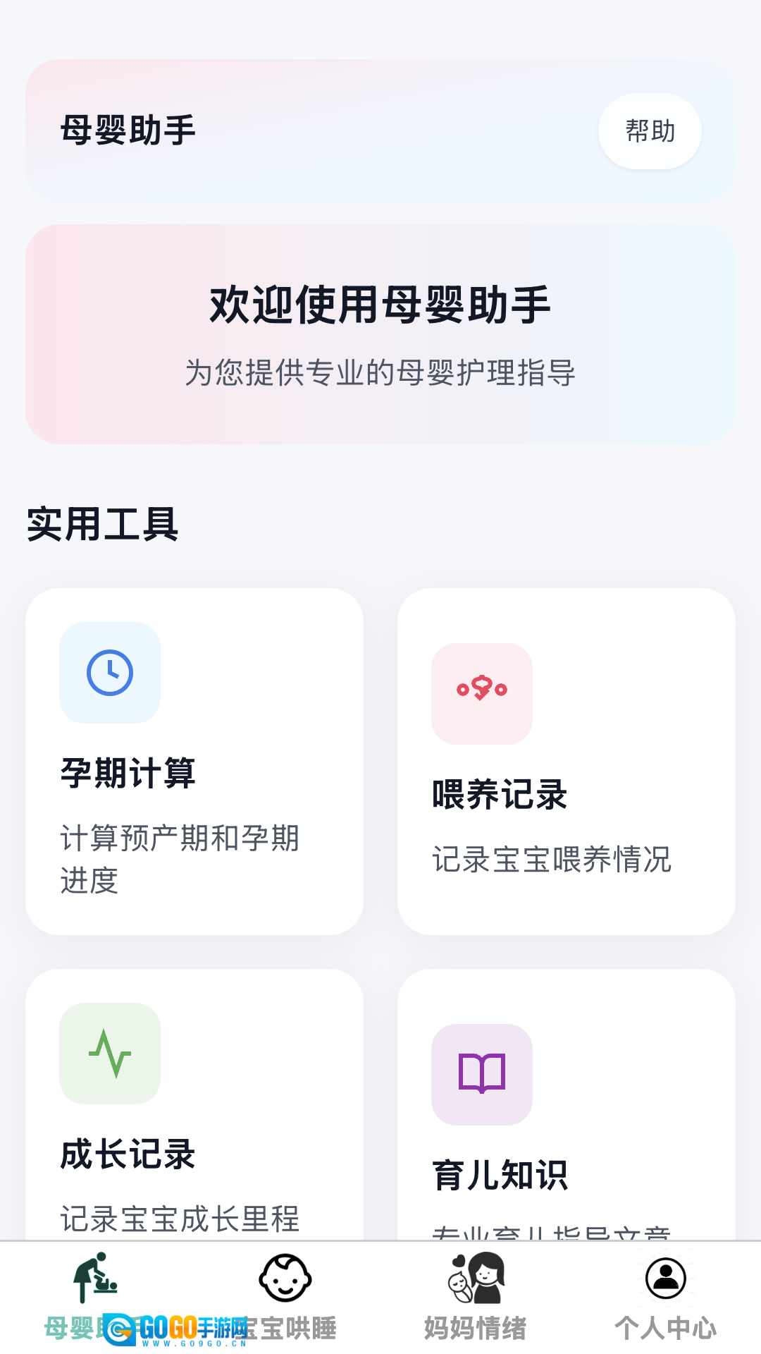 母婴助手页面涵盖了孕期计算、喂养记录、成长记录、育儿知识等功能板块。