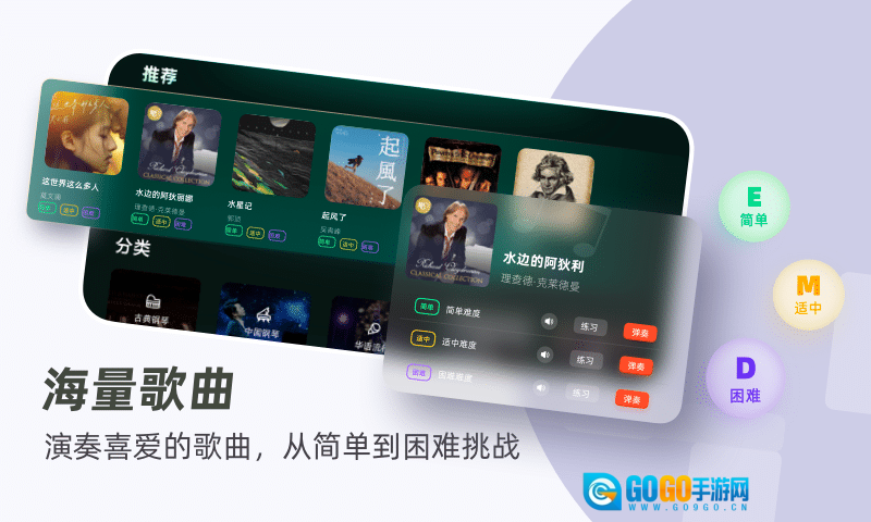1、这款软件收录了风格各异、难度不一的曲目,同时还配备了对应的音乐知识内容;