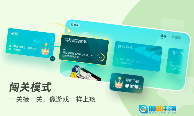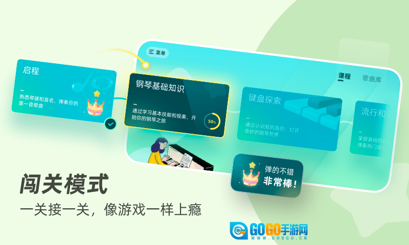 5、闯关模式:软件配备闯关模式,使钢琴学习如同游戏般充满吸引力。用户能够借助完成各项任务,逐步向更高难度的关卡发起挑战,从而提升自身的演奏技能与乐理知识。