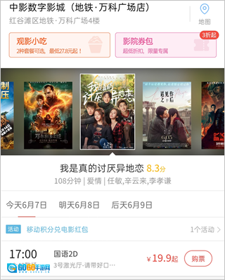 可以定位距离自己最近的电影院,实时查询影片的放映时间以及可购票的场次。