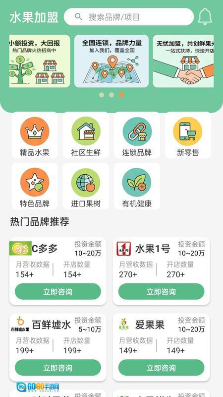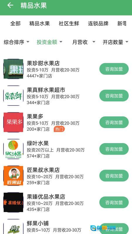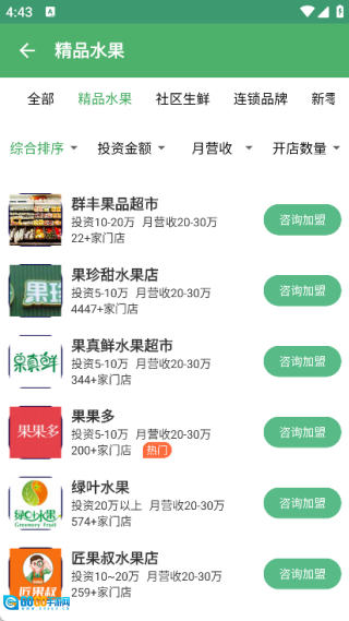 在精品水果页面,你能够了解各类店铺的相关信息,同时也可以进行咨询加盟事宜。