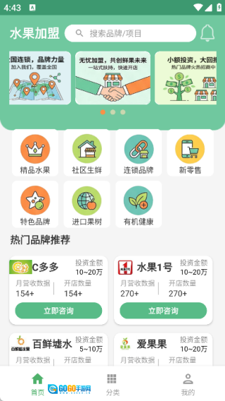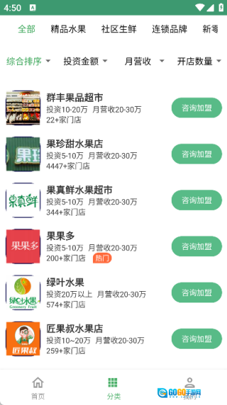 在分类页面能够查看各类水果店的信息,随时都能咨询加盟相关事宜。