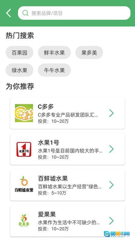支持依据投资预算、品牌名称进行分类搜索,助力快速锁定心仪的水果加盟项目,精准匹配创业需求。