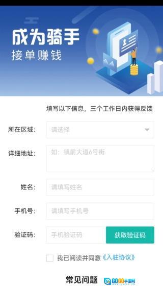 安装软件并打开后,进入登录界面,点击下方的“骑手入驻”选项,即可进入注册界面。在此界面中,骑手可以详细阅读各类常见问题说明,这将使后续操作更加便捷顺畅。