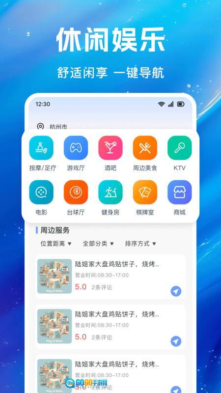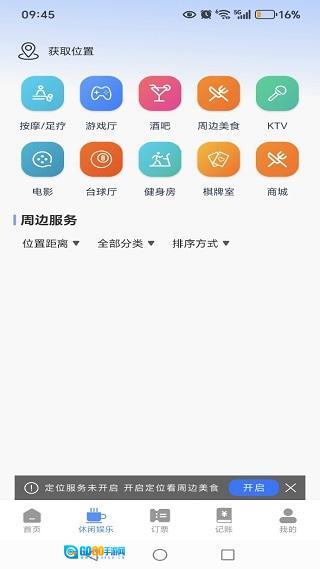 在休闲娱乐页面,只需一键定位,即可快速获取周边各类吃喝玩乐商家的详细信息。