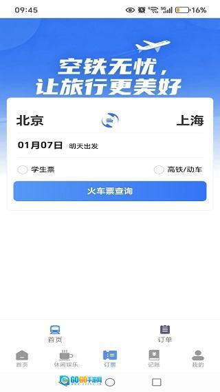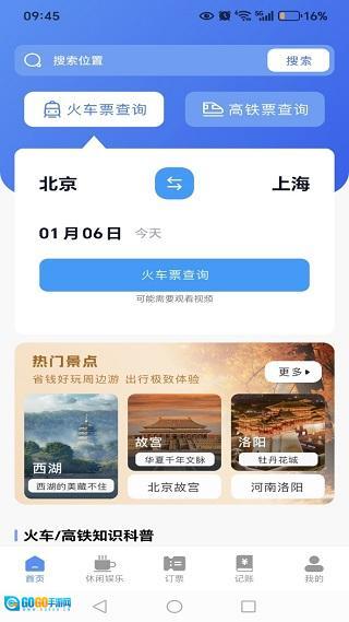 安装进入首页,支持火车票和高铁票查询服务。