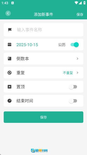点击底部的倒数日标签,接着选择“+ 添加”按钮,输入事件名称、挑选日期并设置重复规则,最后点击保存,就能完成新倒数事件的创建了。