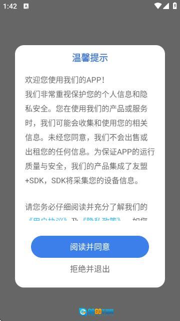 打开软件后,会弹出温馨提示框,用户需仔细阅读用户协议和隐私政策,点击阅读并同意才能进入主界面。