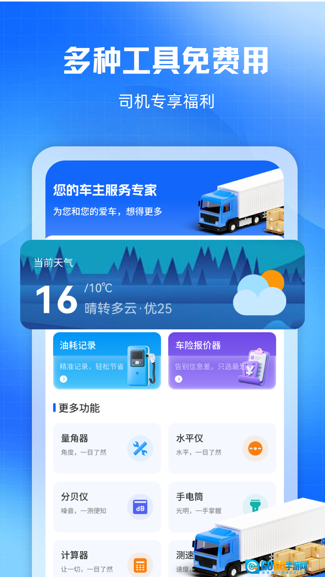量角器、水平仪、分贝仪、测速仪等实用工具,能满足司机在运输途中的各类临时需求。