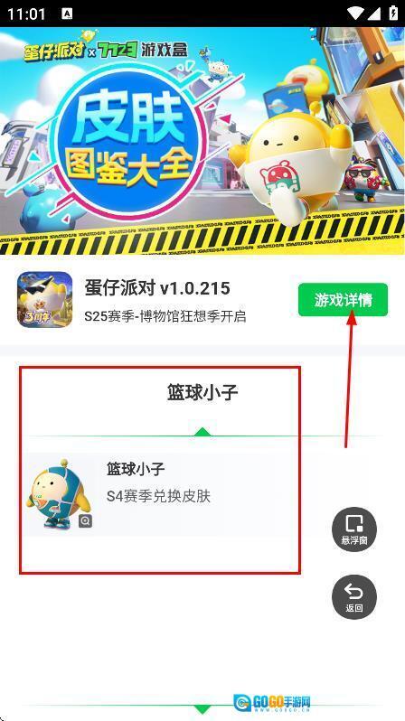 2、在皮肤详情页,点击游戏详情选项,即可跳转至蛋仔派对的游戏详情页面。