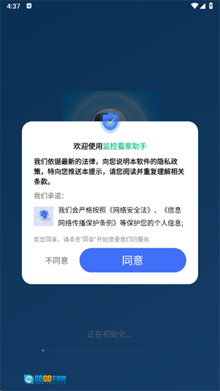 安装监控看家助手App后打开,在弹出的初始用户协议弹窗中直接点击“同意”。