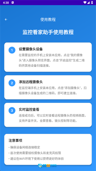 监控看家助手是一款能将旧手机转化为监控摄像头,助你零成本实现家庭安防的软件。只需在两台设备上都安装该软件,按照简单提示完成配对,再将其放置在你希望监控的区域,像家门口、客厅或是宠物窝旁。之后,无论你身处工作岗位还是外出途中,只要拿出日常使用的手机,就能随时随地查看家中的实时画面,同时还能听到现场声音。