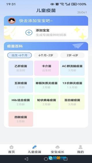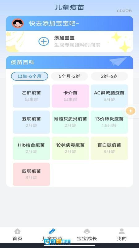在儿童疫苗页面,呈现婴幼儿不同成长阶段对应的疫苗接种时间点。